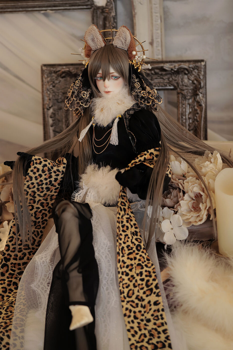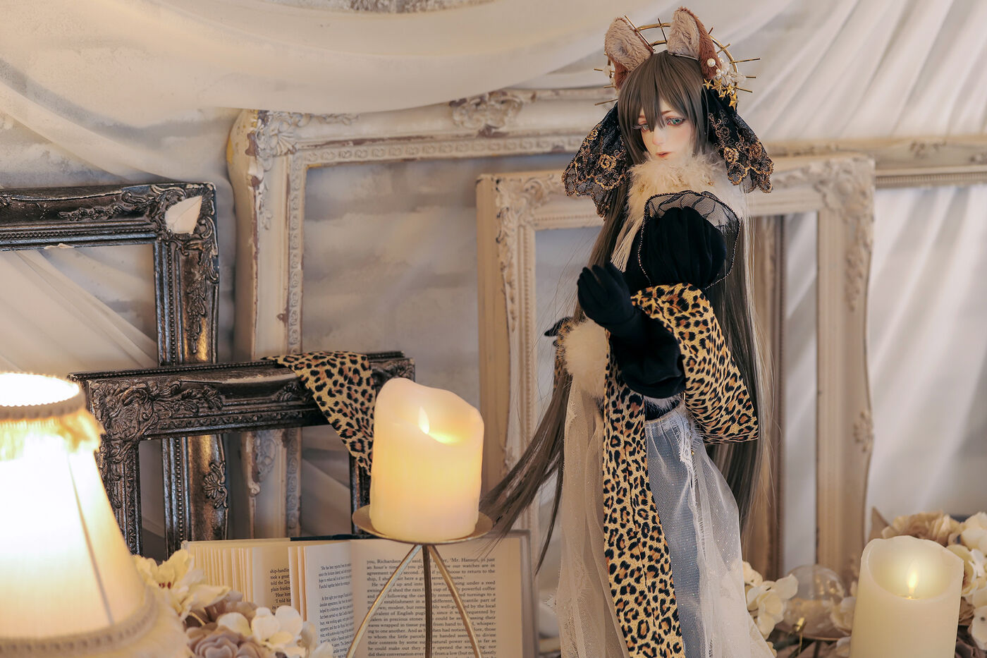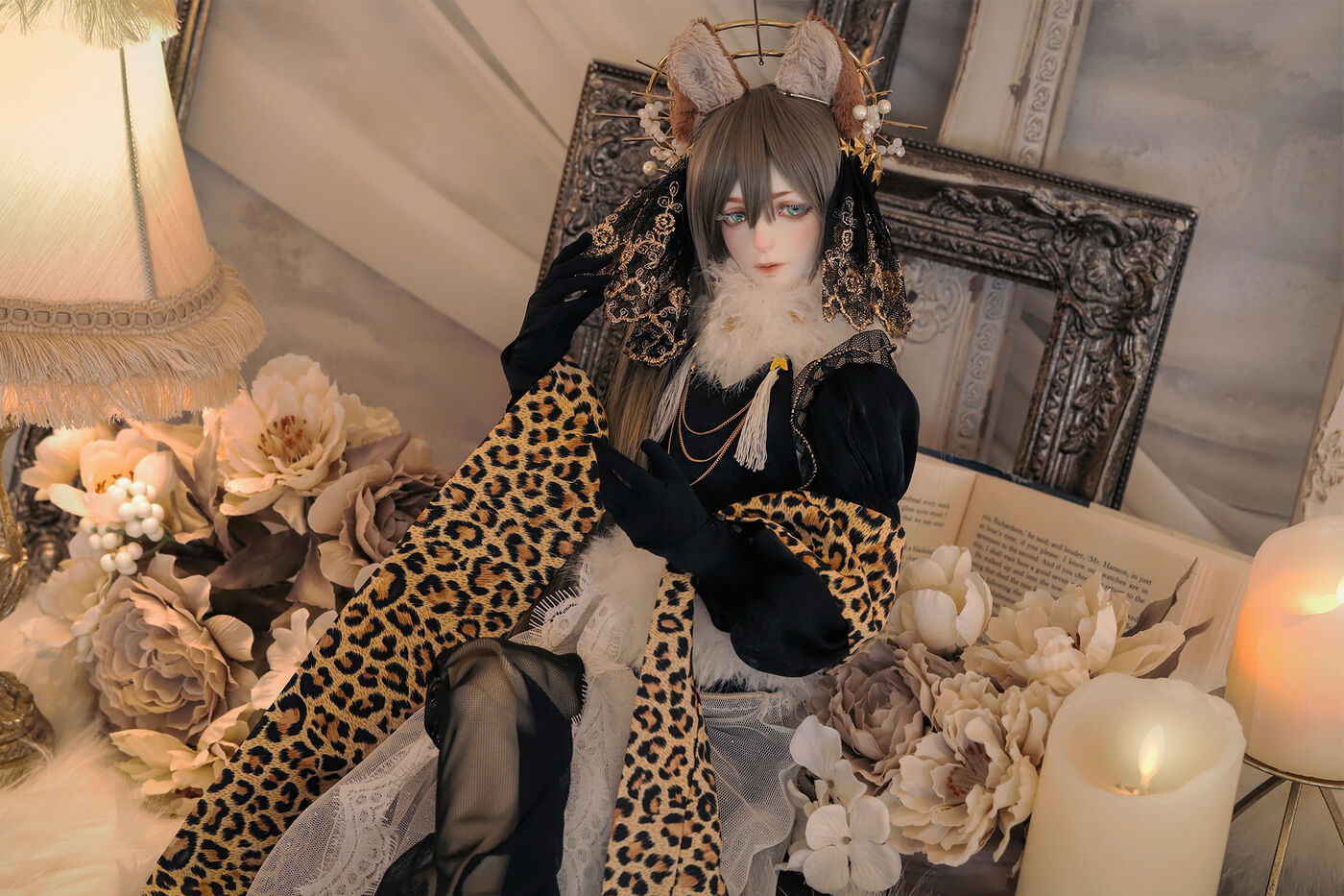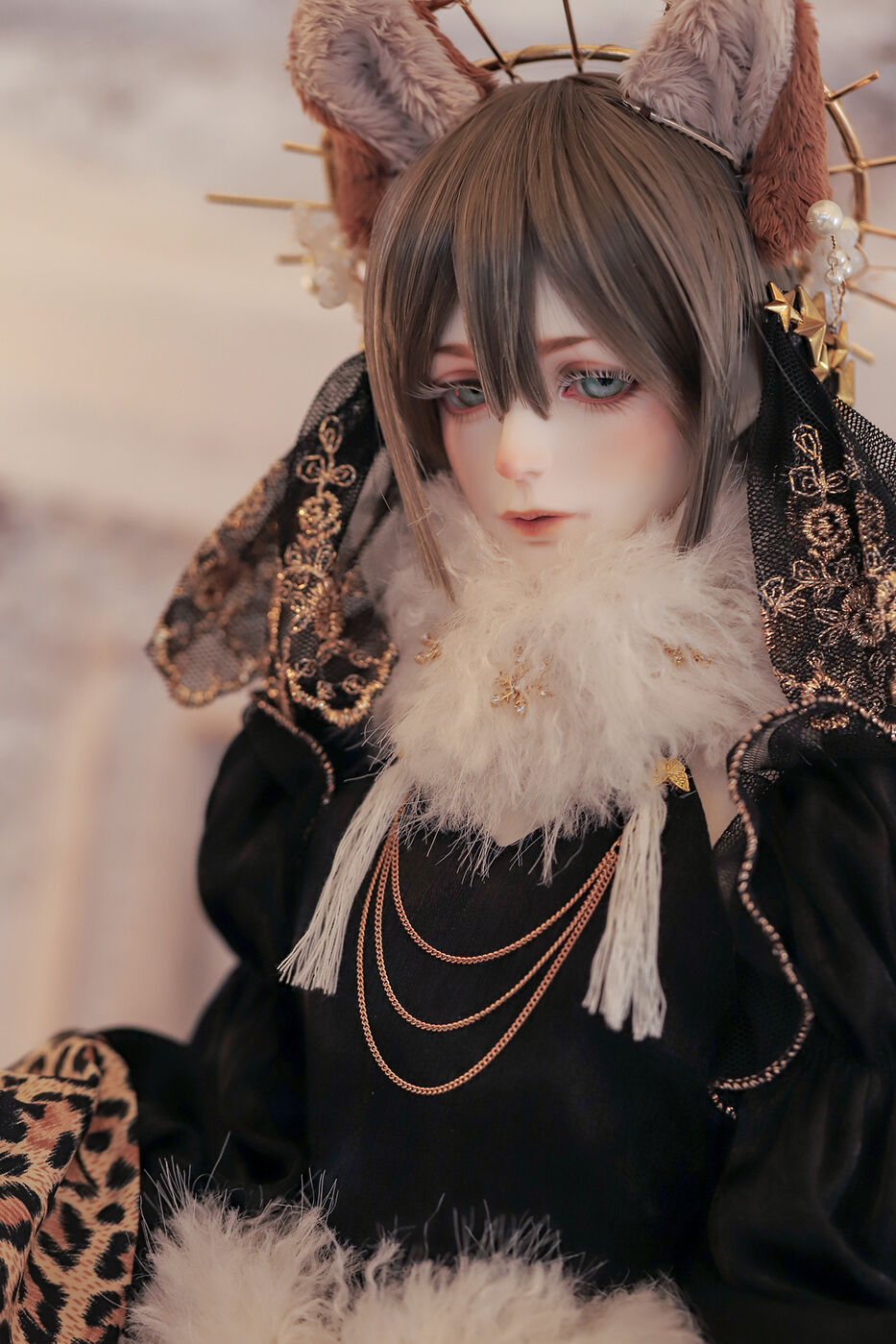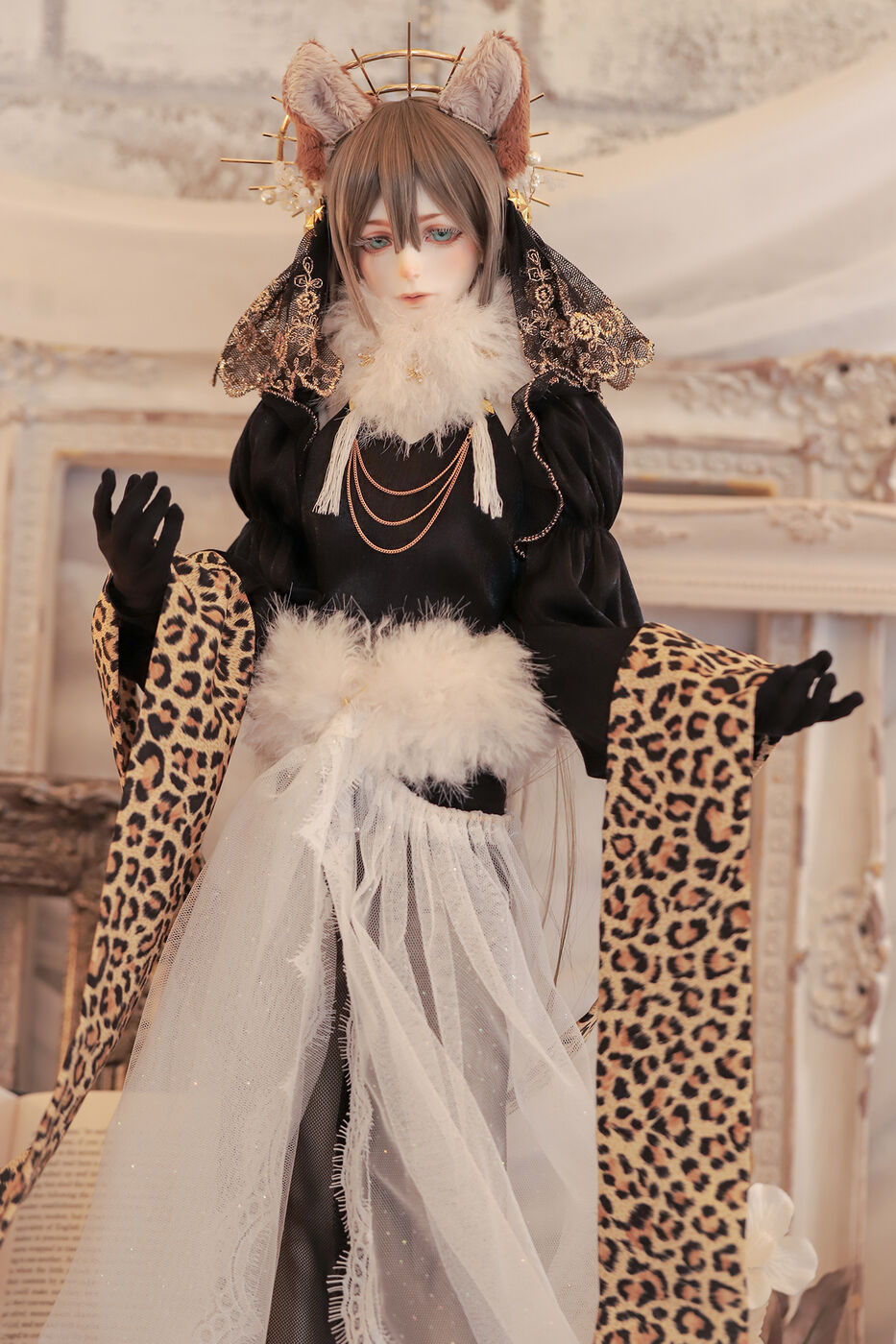 ドール服の専門メーカーZ-agramによって、輝く光輪や、猫耳のそばで輝く星・パールの装飾が美しい特別感ある一着に仕立てられています。漆黒の異素材を組み合わせることで生まれる奥行きが、ドレスの表現を極限まで高めています。