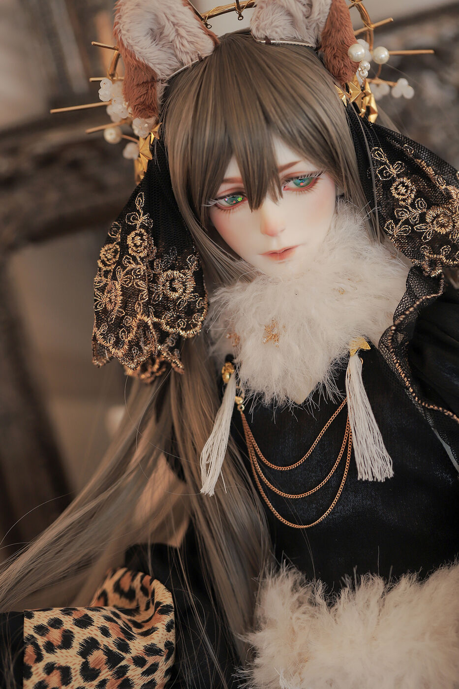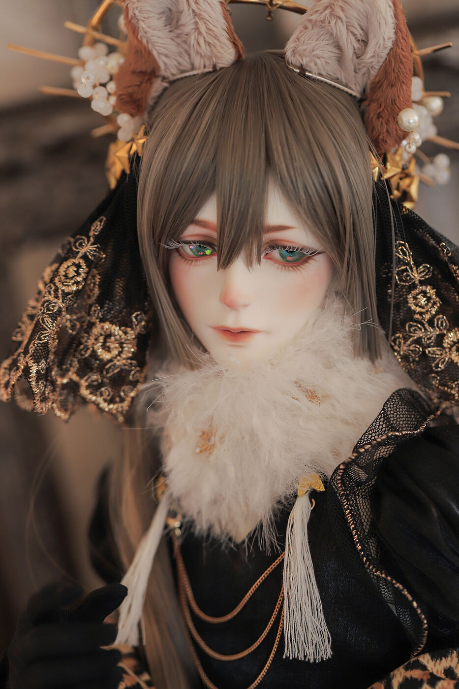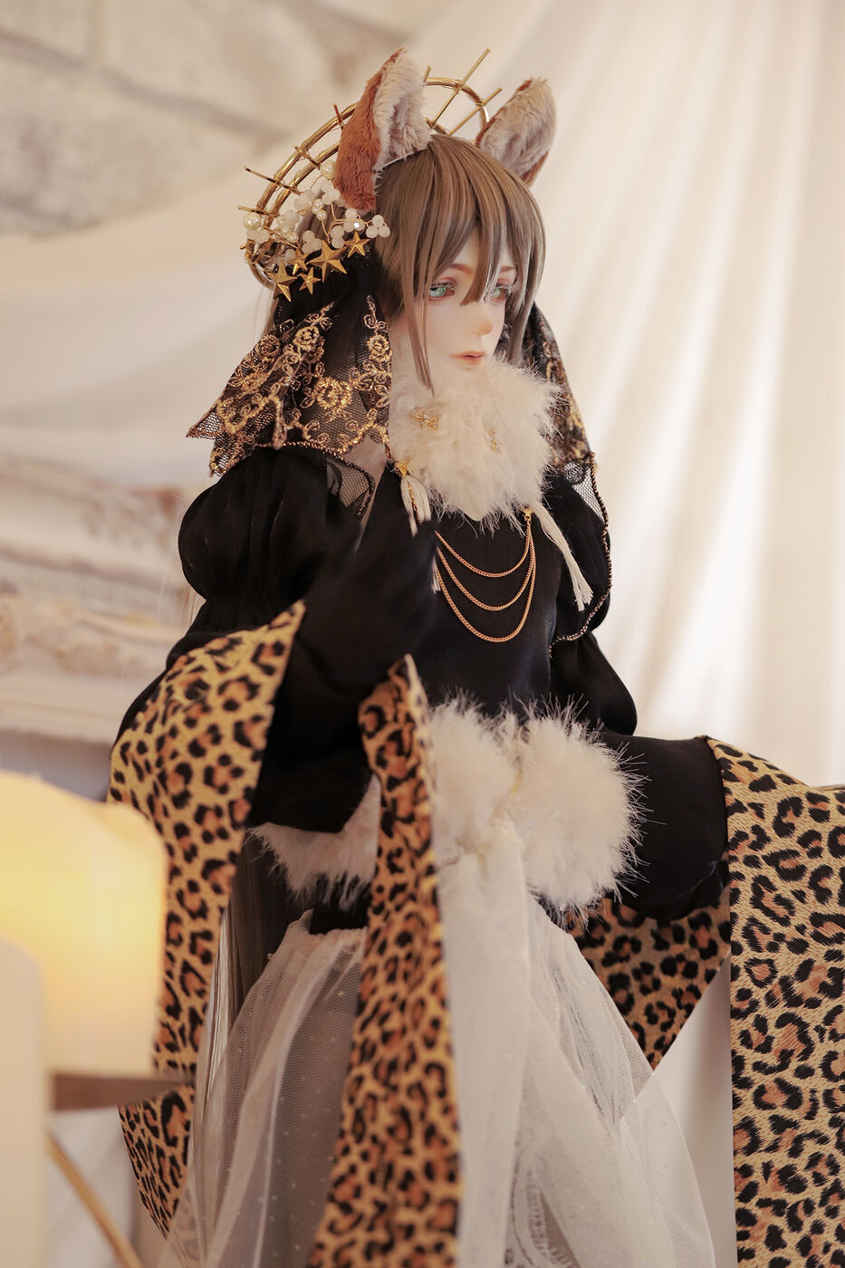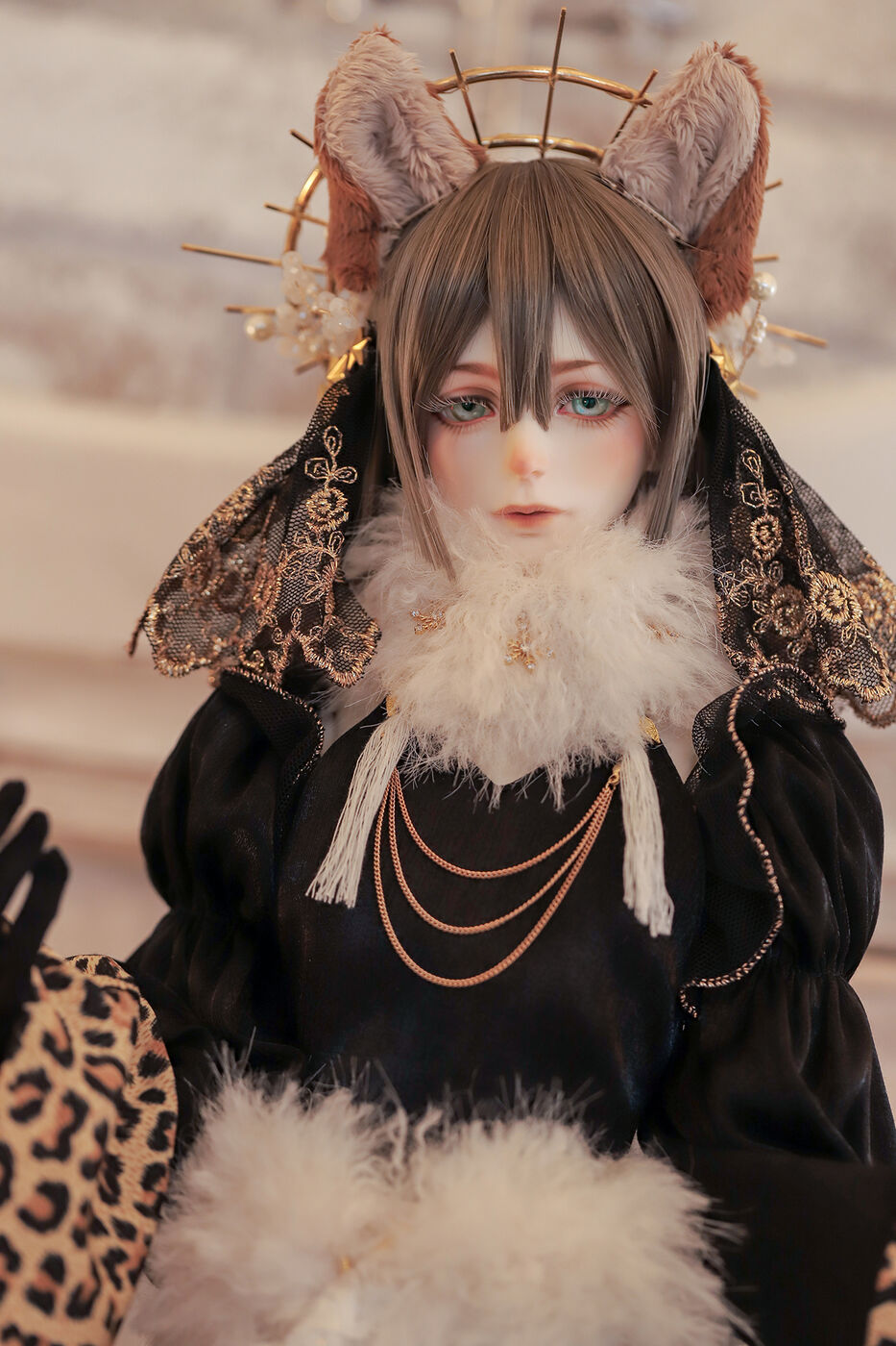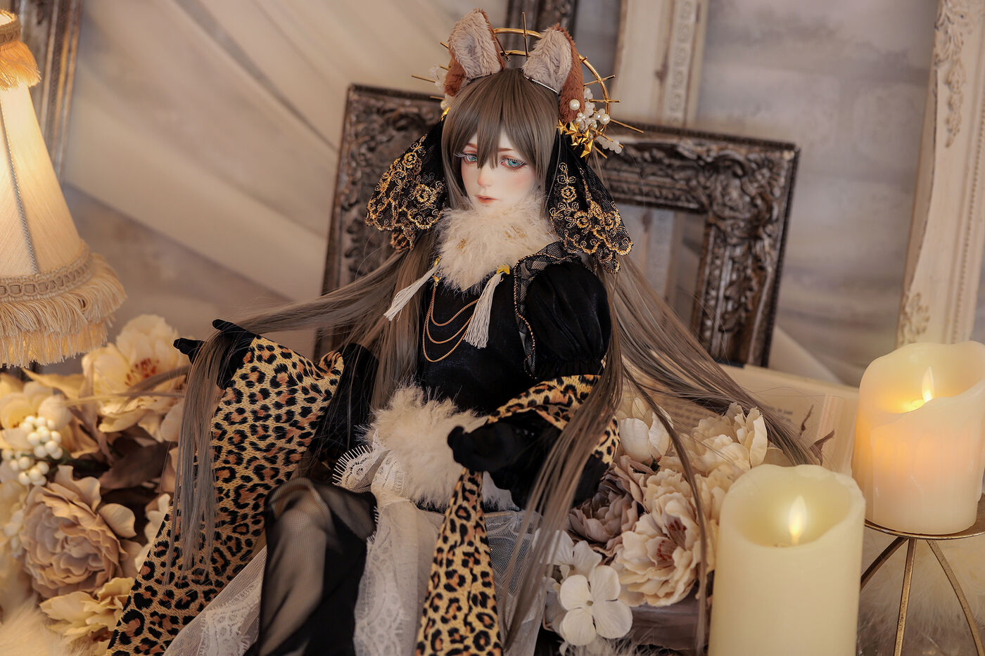 ドール服の専門メーカーZ-agramによって、輝く光輪や、猫耳のそばで輝く星・パールの装飾が美しい特別感ある一着に仕立てられています。漆黒の異素材を組み合わせることで生まれる奥行きが、ドレスの表現を極限まで高めています。