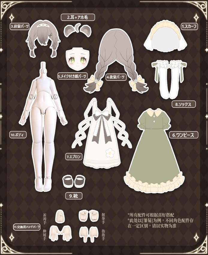 ※こちらの商品には、眠眠 (Parallel color ver.)1セット、薔薇 (Parallel color ver.)1セット、ステッカー*7、パンプキンパンツ*7、ノーメイクフェイスプレート(アイホールあり) *7、アイプレート(クリア) *7ペア、ノーメイクフェイスプレート(アイホール無し) *7、アウトフィット 「プラチナアイドル」 1セット、ヘッドの蓋*7、染色防止インナー*1枚、アウトフィット「イチゴメイド」1セット、ピンクプリーツスカート、ソフトキャミワンピース、スリーピングフェイス、デカールメイクシート、ノーメイクウィッグパーツ*6、クリアウィッグパーツ、(シークレットドール)ノーメイクウィッグパーツが付属します。
