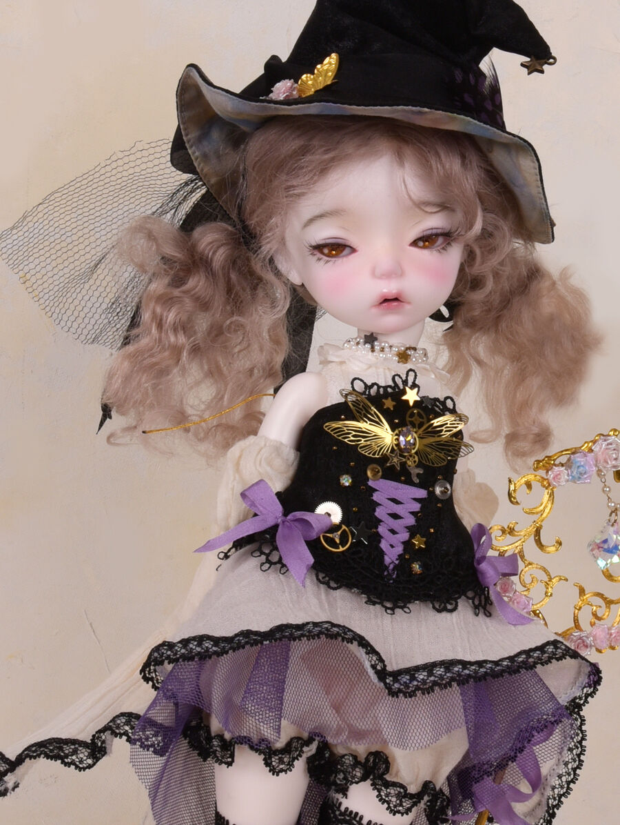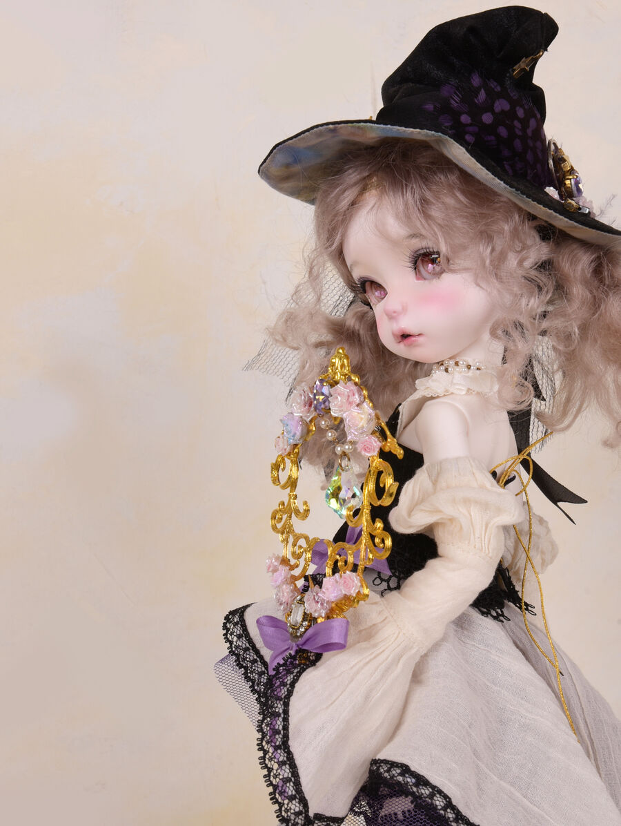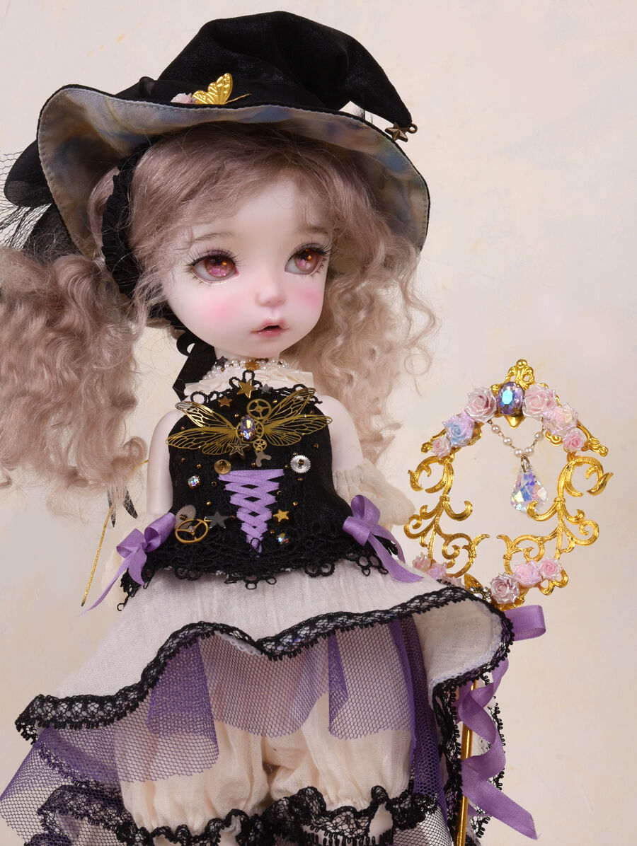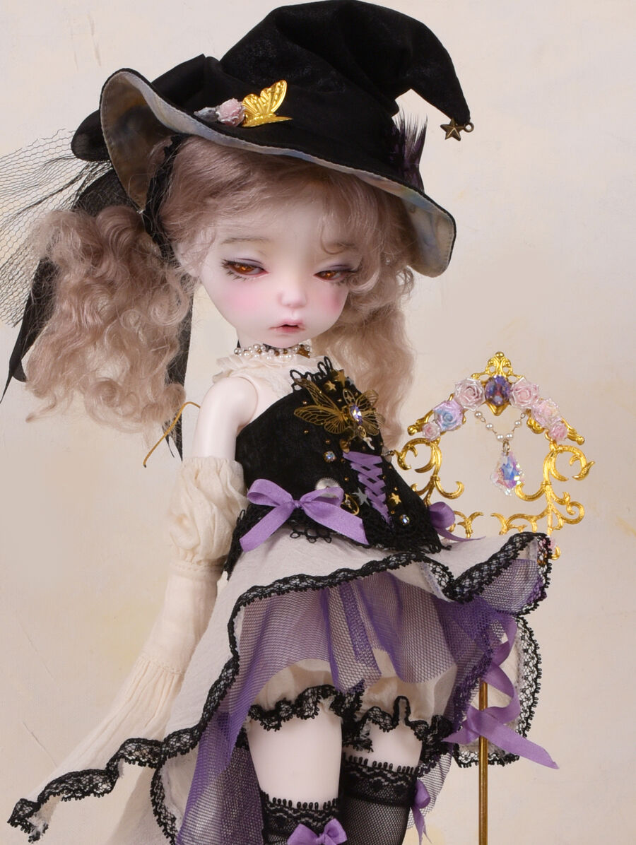 Moi Atelierが仕立てる魔法使いのドレスセットは、コラボドールの世界観を饒舌に物語る、ドラマチックな仕立てに。杖や帽子のディテールや、生地の質感、色のバランスまで、アンティーク感と今までのiMda Dollになかった新しさの両方を追求した品質高い限定ドレスが完成しています。