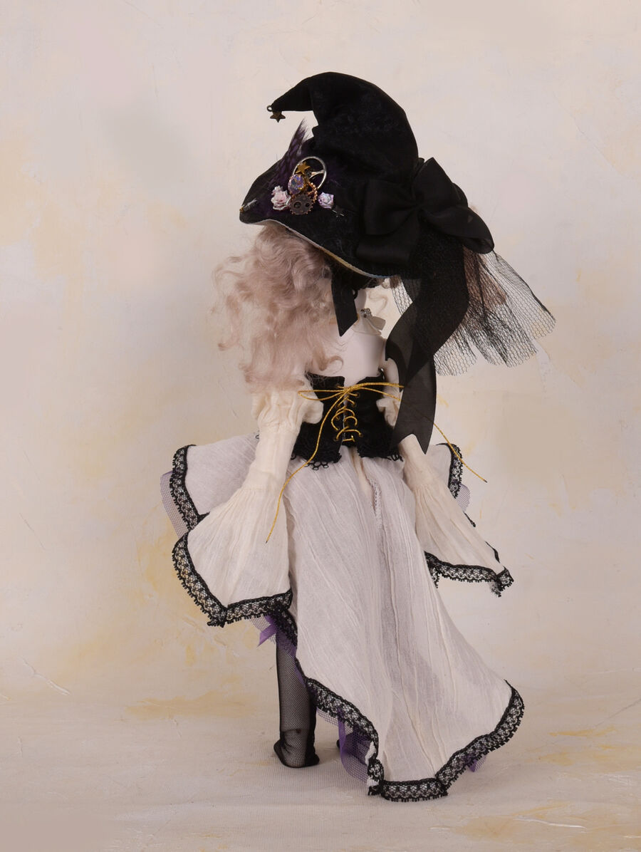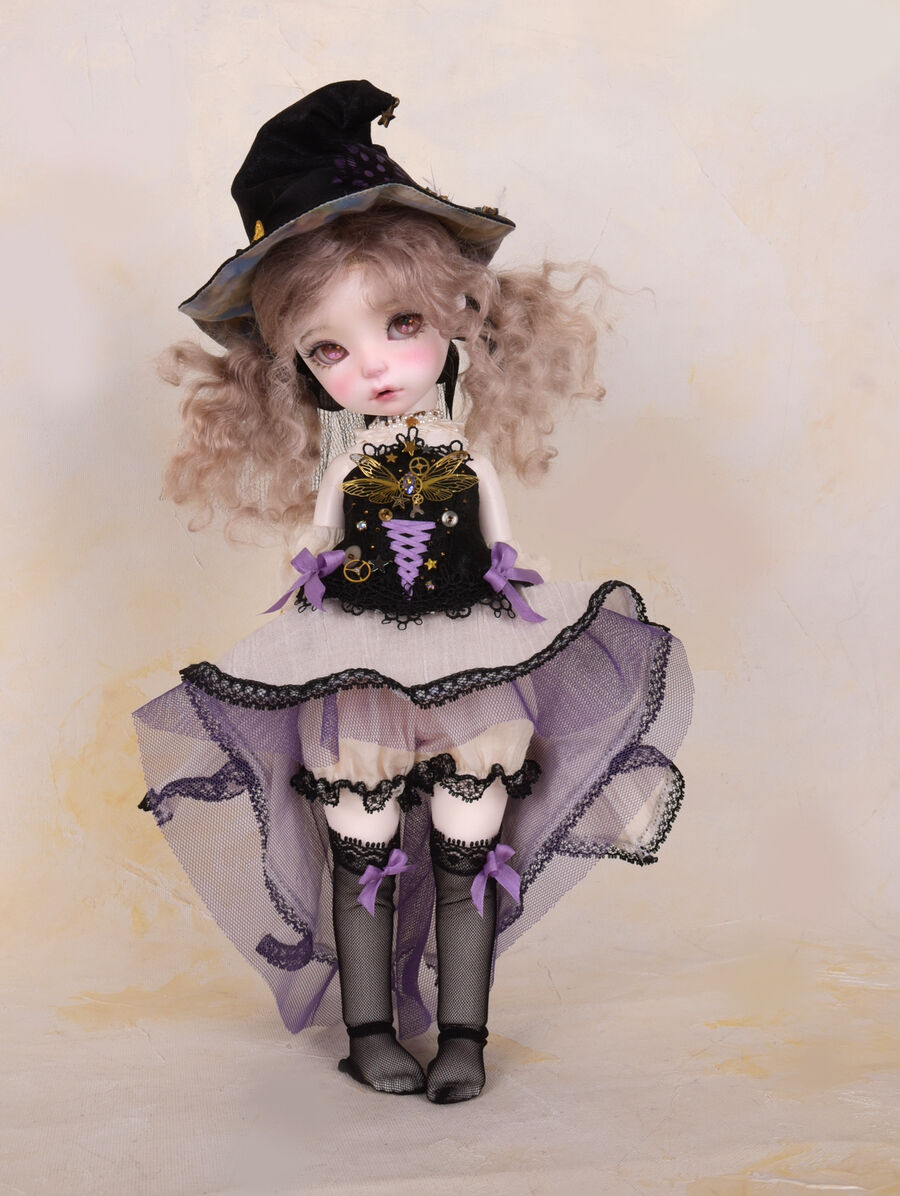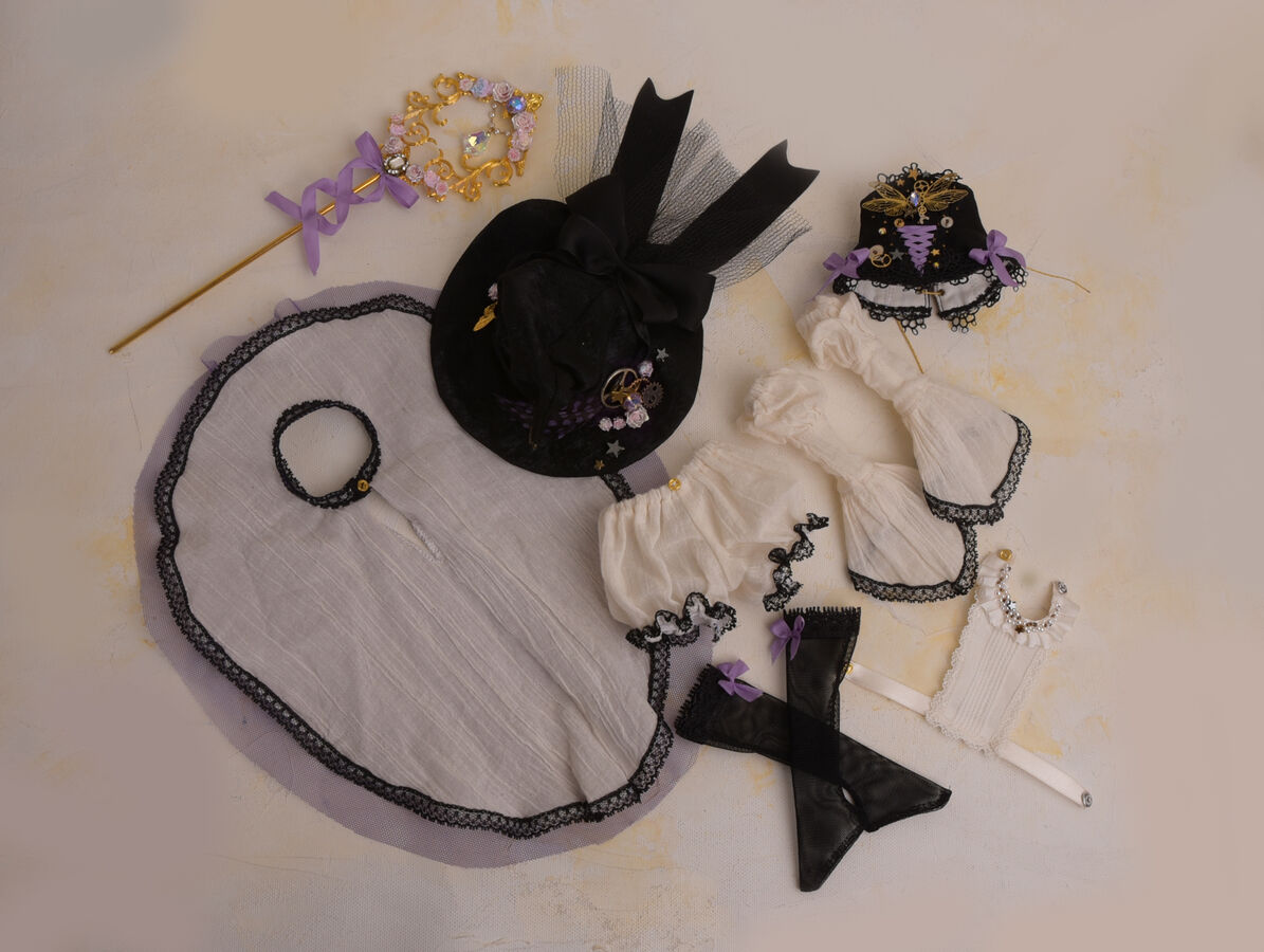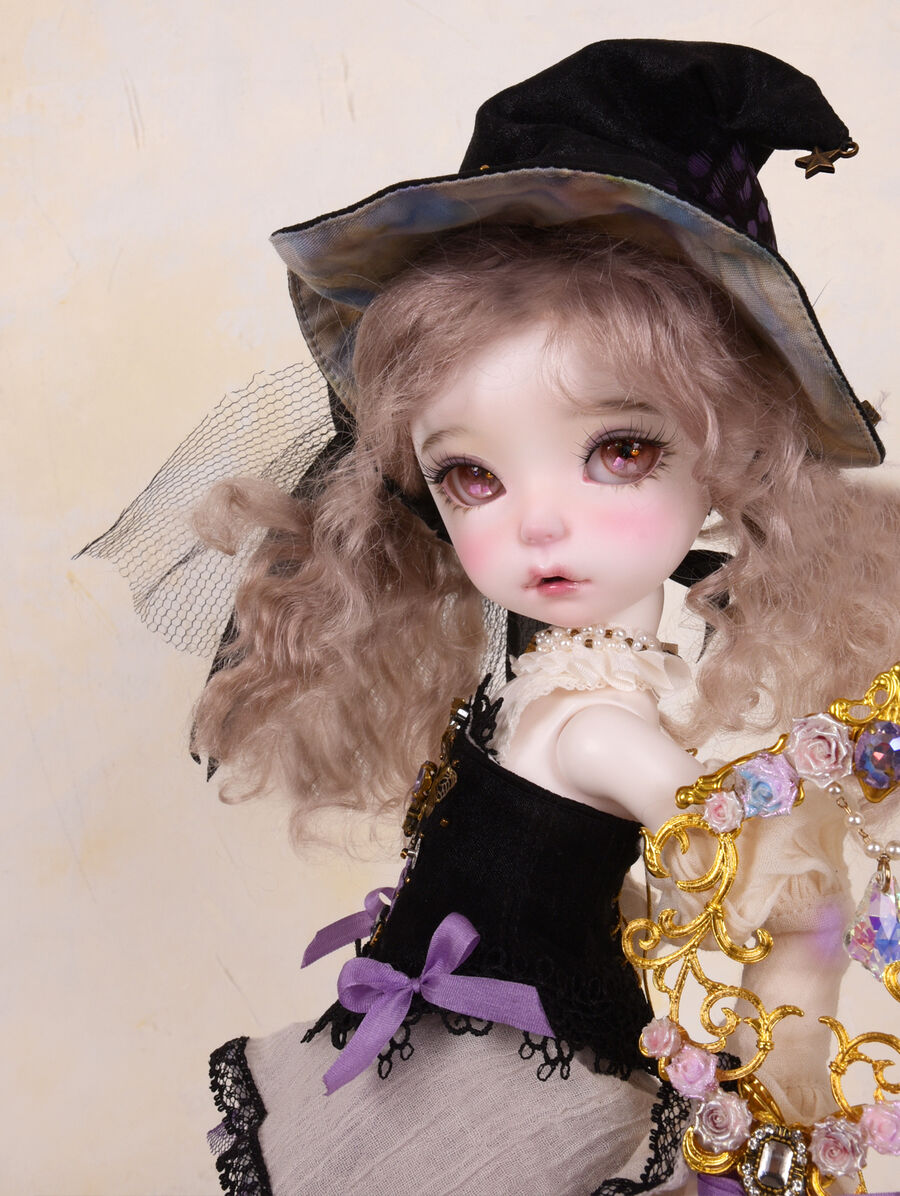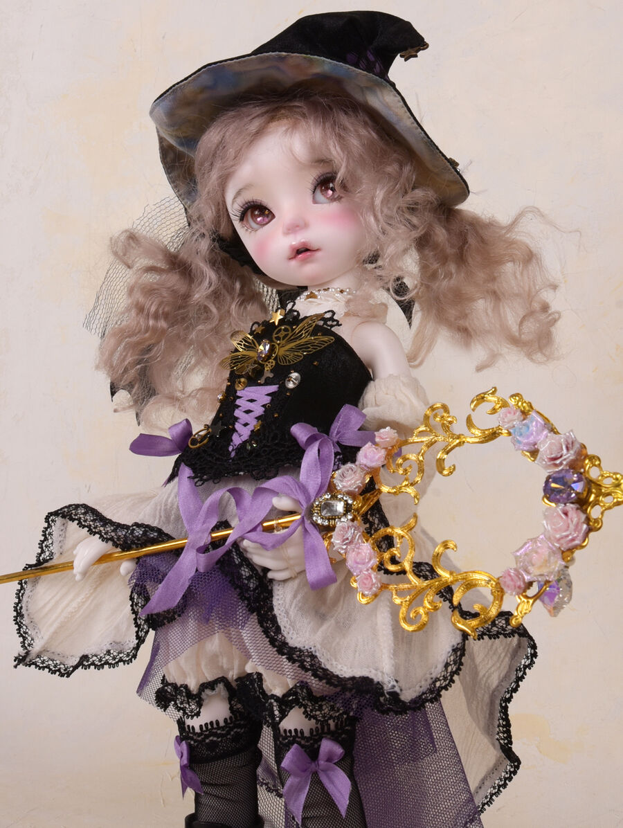 Moi Atelierが仕立てる魔法使いのドレスセットは、コラボドールの世界観を饒舌に物語る、ドラマチックな仕立てに。杖や帽子のディテールや、生地の質感、色のバランスまで、アンティーク感と今までのiMda Dollになかった新しさの両方を追求した品質高い限定ドレスが完成しています。