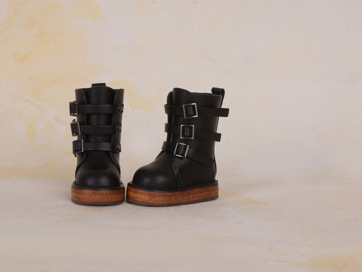 魔法使いの世界観を引き締める、ブラックカラーのブーツ。丈感や、ウッド調のソールまで、ドールのためのアイテムとして、こだわりを感じさせる仕上がりとなっています。