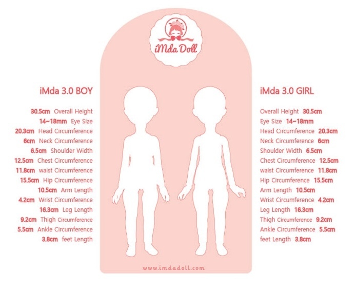 | 3.0 Girl (30cm) | 30.5 | 20.3 | 6 | 6.5 | 12.5 | 11.8 | 15.5 | 10.5 | 4.2 | 16.3 | 9.2 | 3.8 | --- | 7.5~8 | 14~18 |