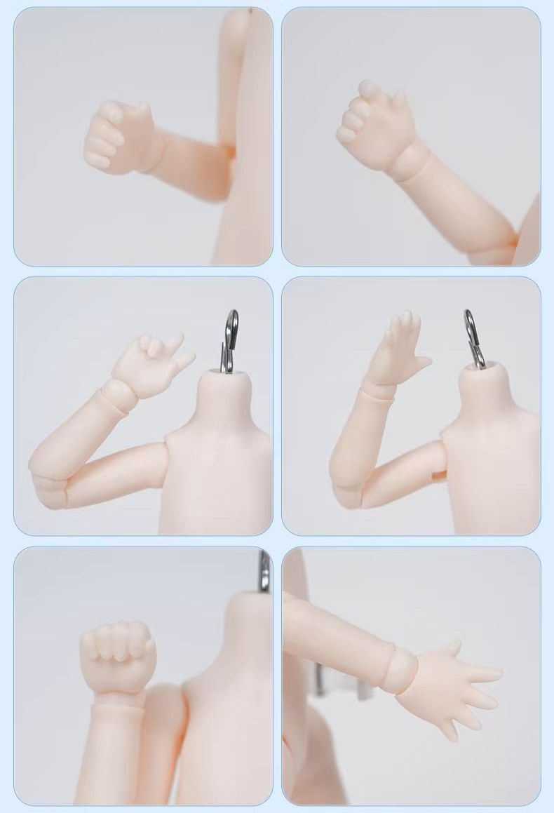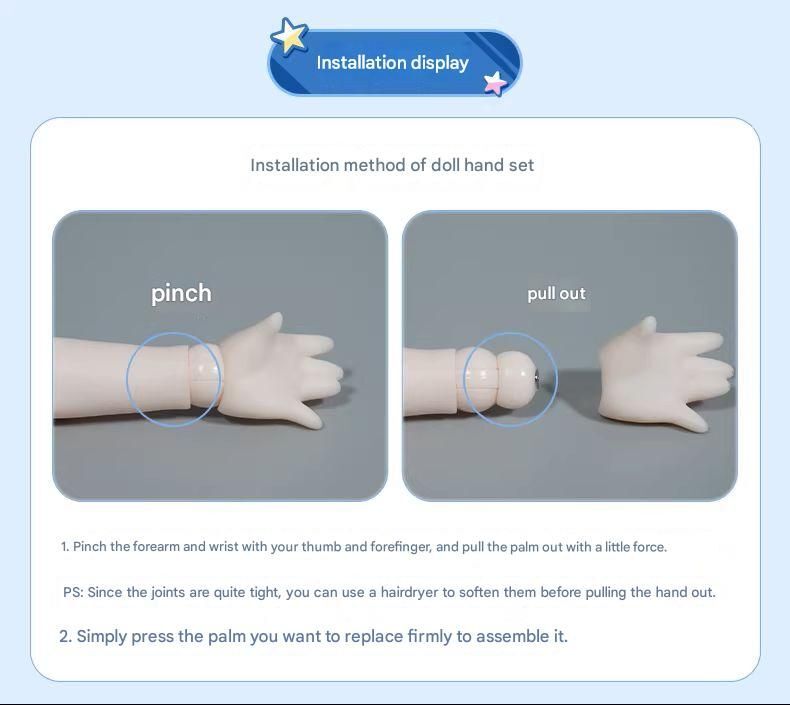 夏場の高温や輸送中に長時間日光にさらされると、ドールが柔らかく感じることがあります。この場合は、涼しい場所で約2時間、または冷蔵庫で約1時間保管すると硬く戻ります。冬の低温による変形は、ドライヤーやぬるま湯に1分ほど浸けて温めることで復元可能な場合があります。