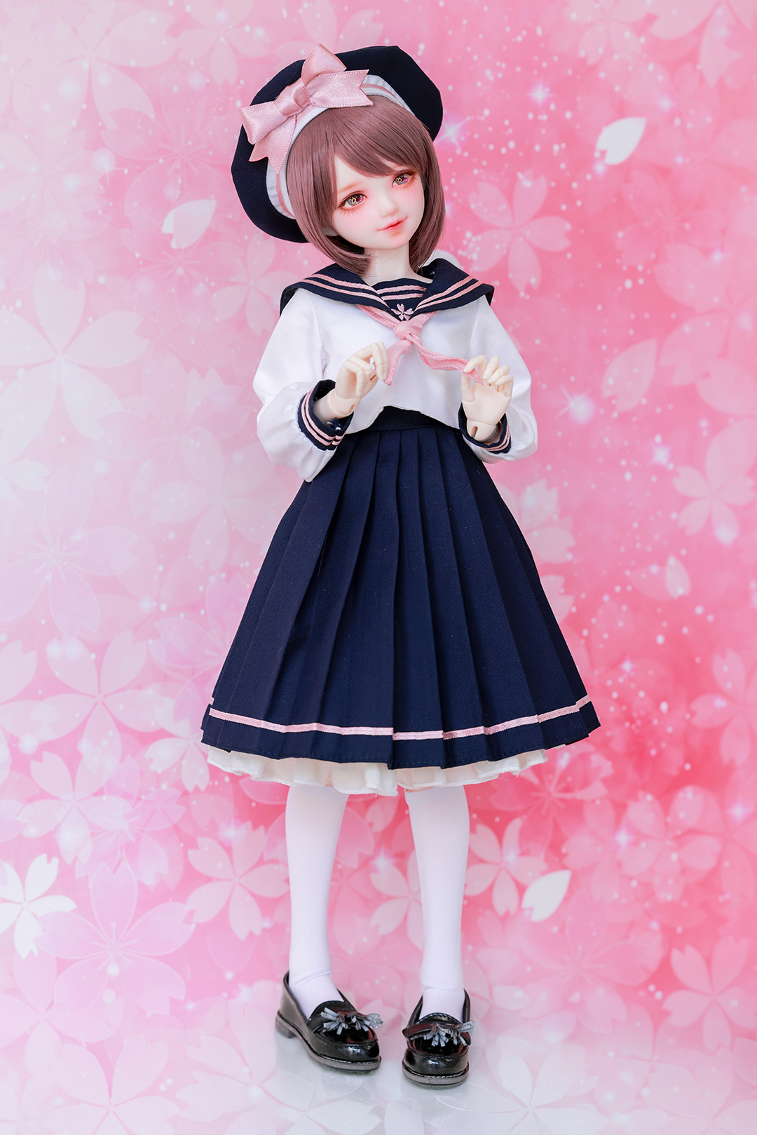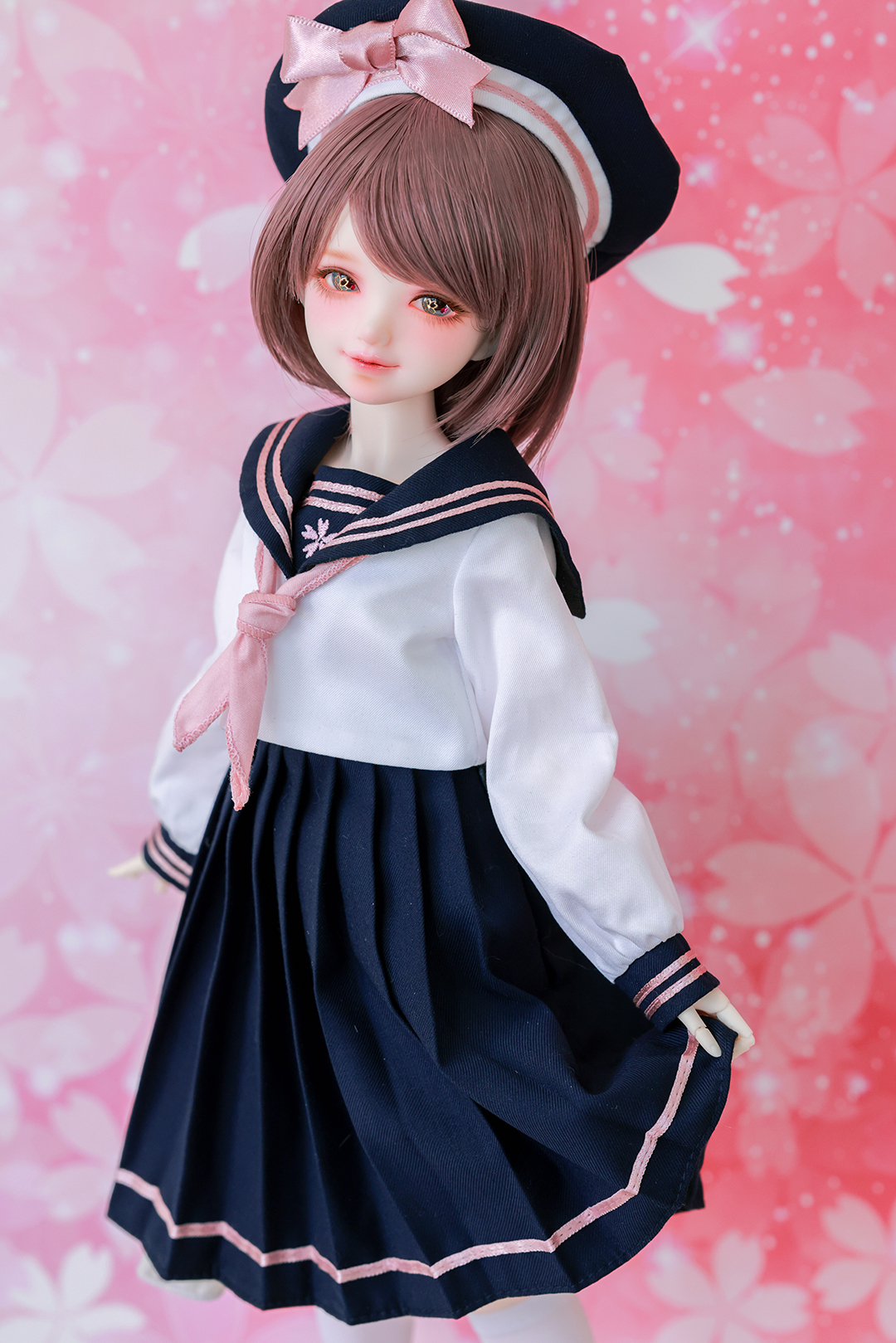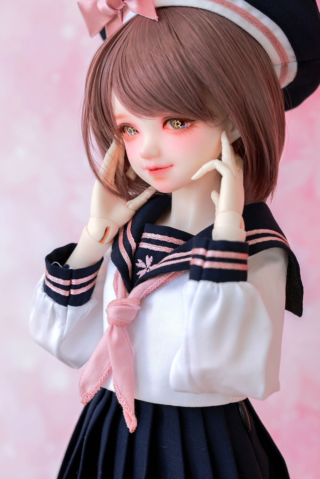 SADOLが仕立てる制服はDingDangの専用サイズで仕立てられ、制服としては王道の紺を基調にしつつ、ピンクのラインが際立つ溌溂とした仕上がりに。そして、今回のコラボ限定カラーである桜色がかったピンクブラウンのボブが、瑞々しく華やぐDingDangと完璧な調和を奏でます。