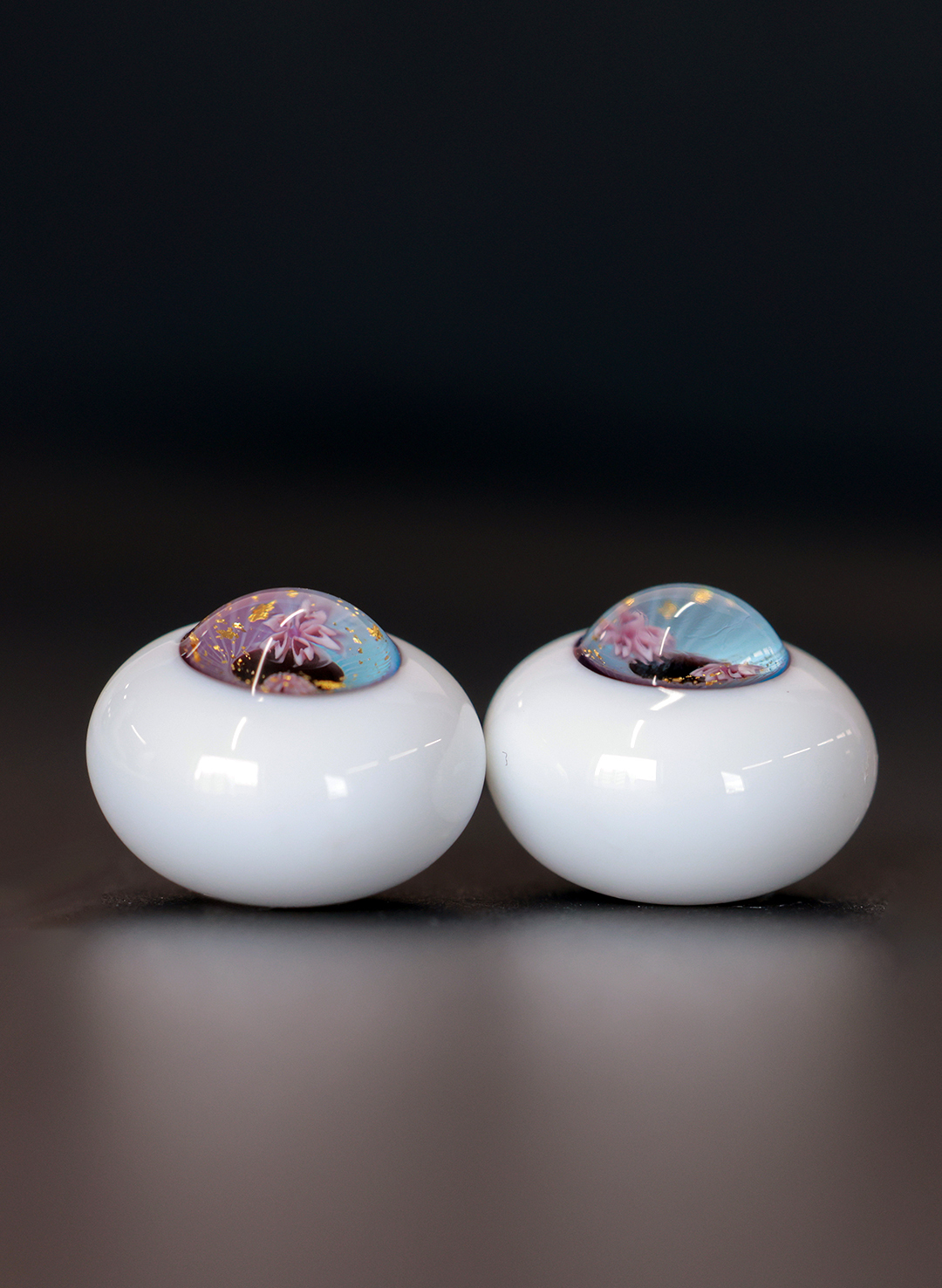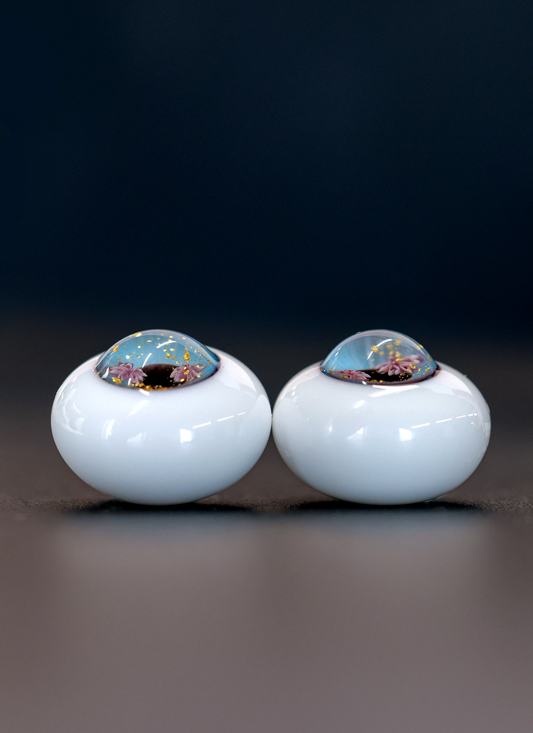 特に大切にしているのは、移ろう日本の「季節感」。厳しい検品基準をクリアした高品質なグラスアイには、自然のモチーフや繊細な色の妙が封じ込められています。工房のグラスアイをドールに装着した瞬間、まるで魂が宿ったかのような強い「目力」を放つアイの数々は、世界中のオーナーを虜にし続けています。