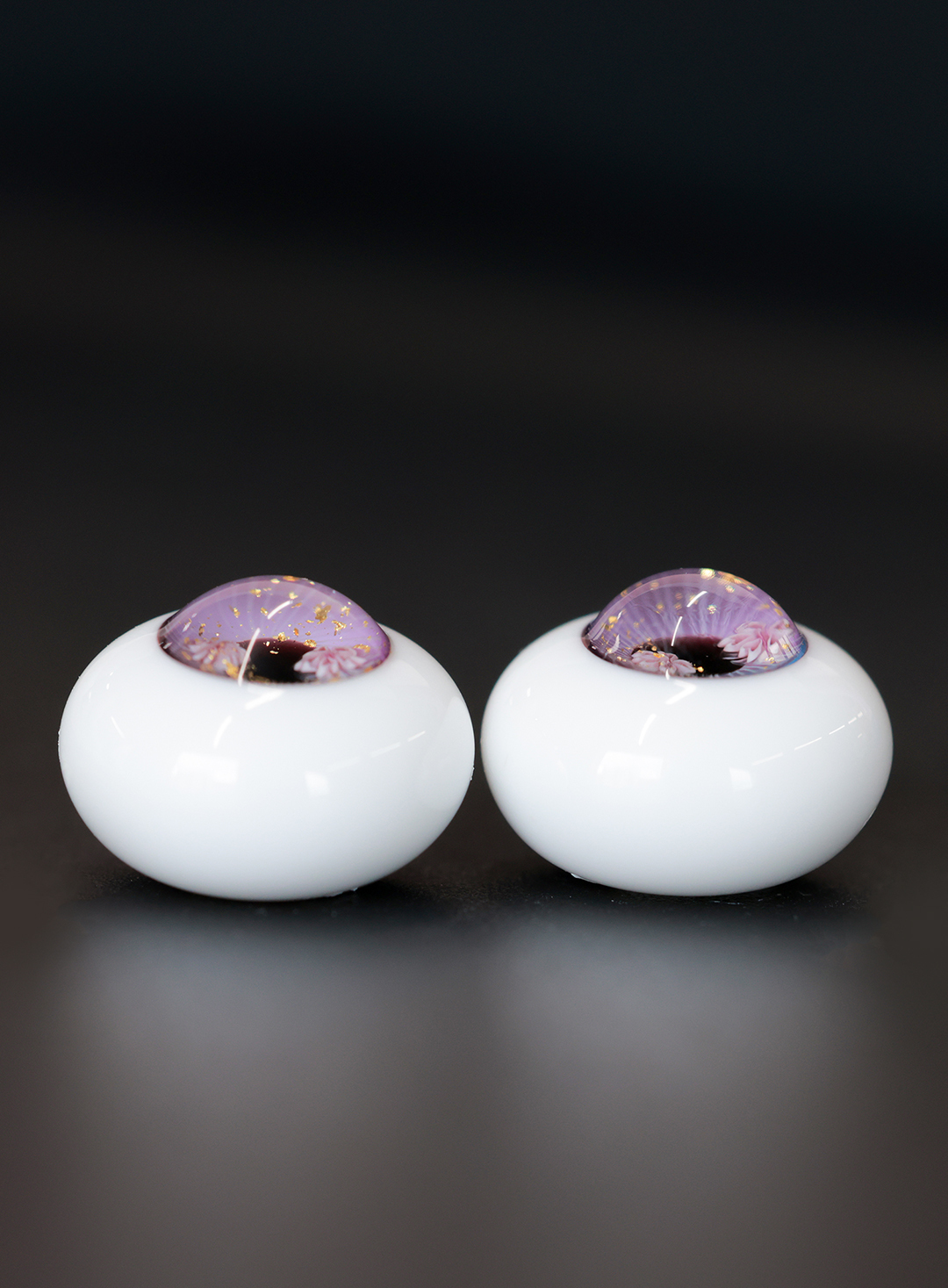 DOLK限定アイとしてリリースされる 桜アイ Premium 2026 ver. は、途方もない手間と時間をかけ、緻密な意匠を凝らした珠玉の仕上がり。落ち着いた紫を帯びた桜色から、夜明けの空を映したような瓶覗(かめのぞき)色へと移ろう、幻想的な虹彩グラデーションが目を引きます。そのわずか8mm、9mmという極小の虹彩の中には、職人による神業によって仕上げられた桜が咲き、雅な金箔が春の光のように美しく舞い踊ります。