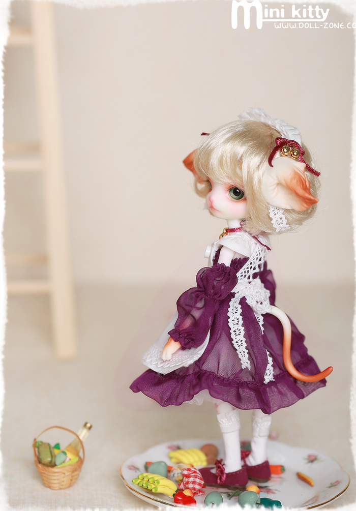 小さな猫の前足の造形や、ボディにあわせて仕立てられるドレスセットなど、猫好きにはたまらないディテールが特徴。大きな猫耳や小さなしっぽなどはそのままに、ボディは自立性が改良された最新版をお届けいたします。