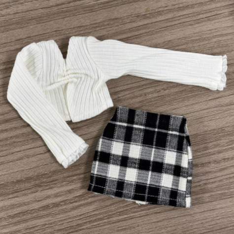 • へそ出しトップス+チェック柄スカート:ブラック(40cm対応)