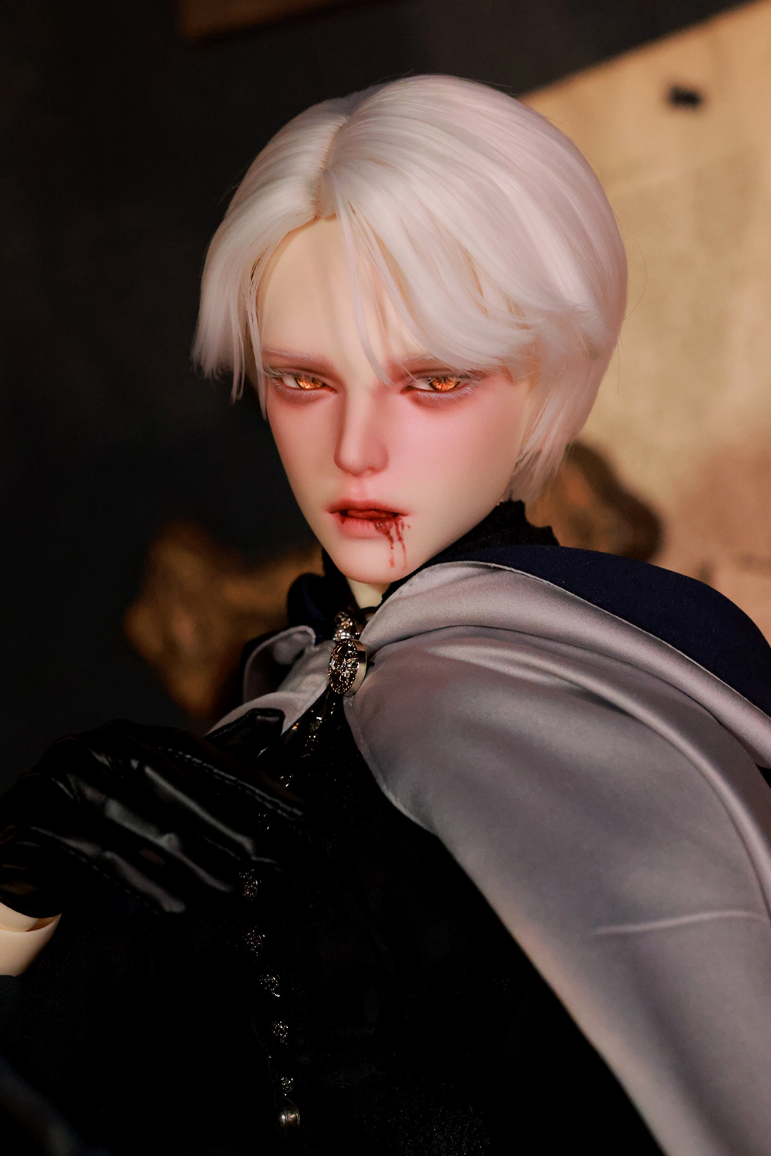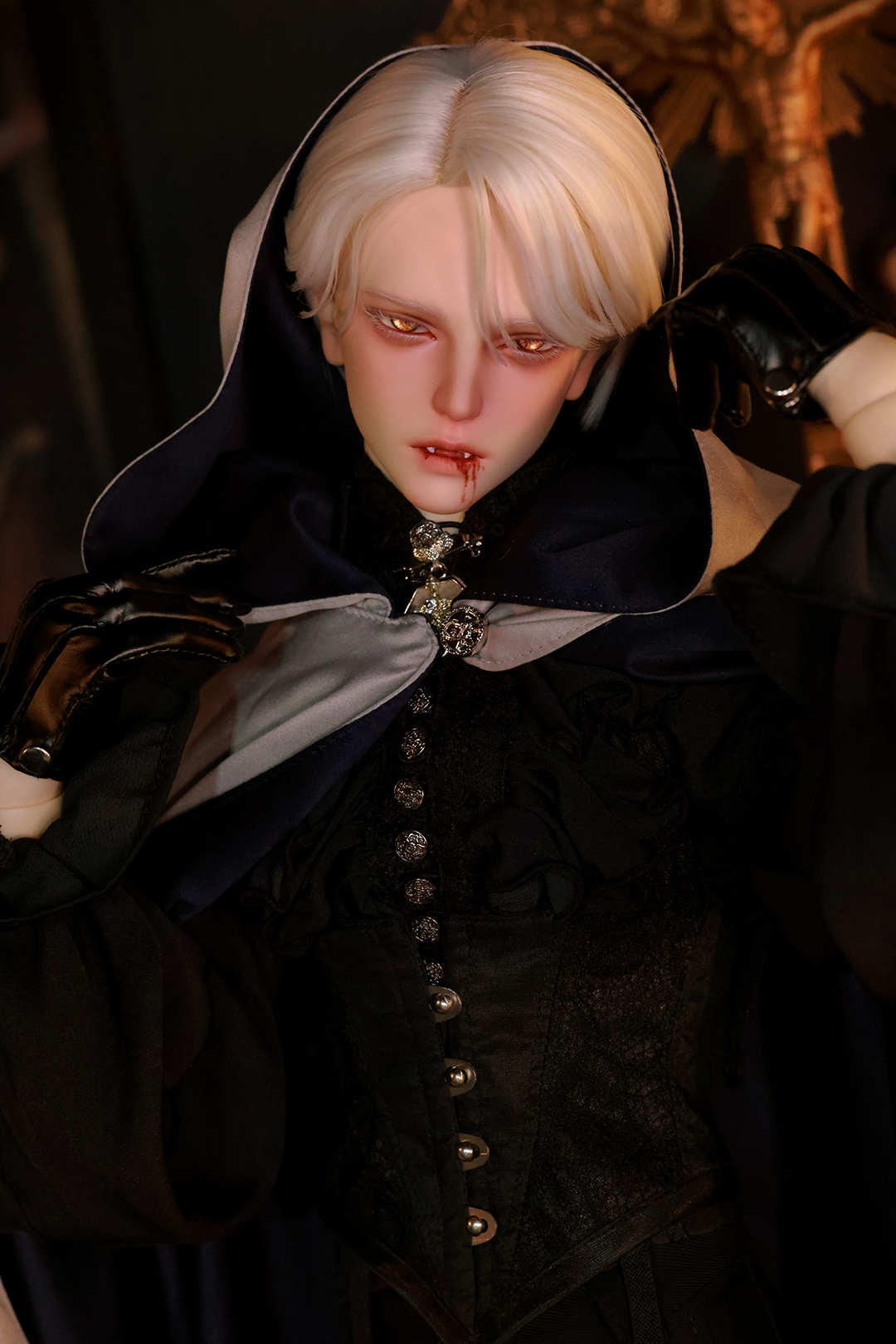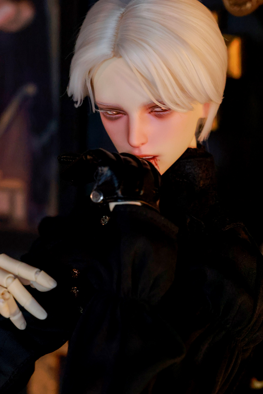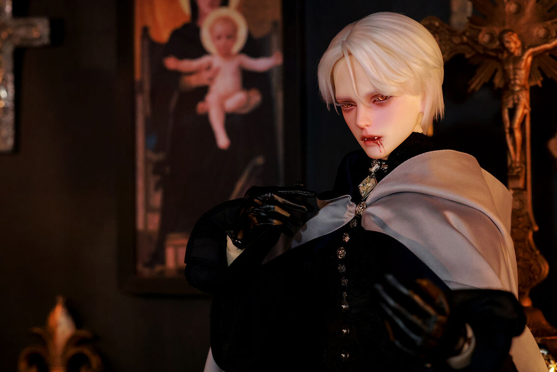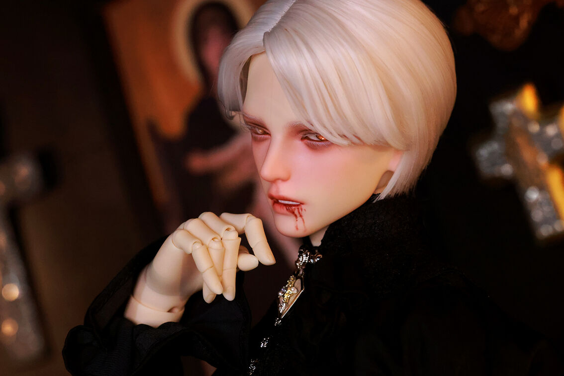 本コラボレーションでは「吸血鬼」をテーマに、尋簡(Xunjian)の持つ端正な造形を、凄艶な姿へと生まれ変わらせました。吸い込まれるような鋭い視線や、人ならざるものを感じさせる神秘的な肌質感。細部に至るまで荒浍氏の美意識が宿る、芸術的な仕上がりを楽しめます。