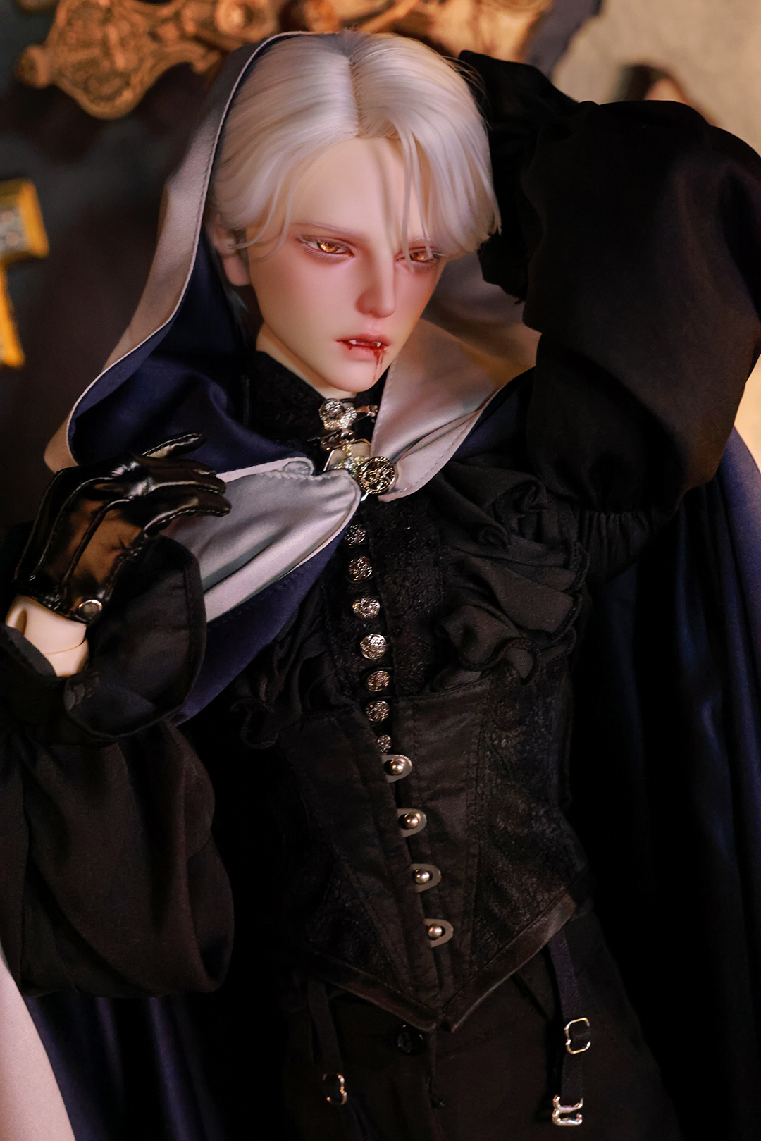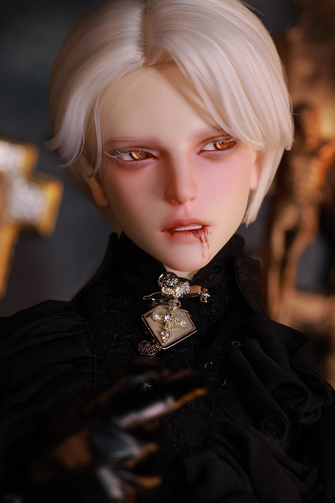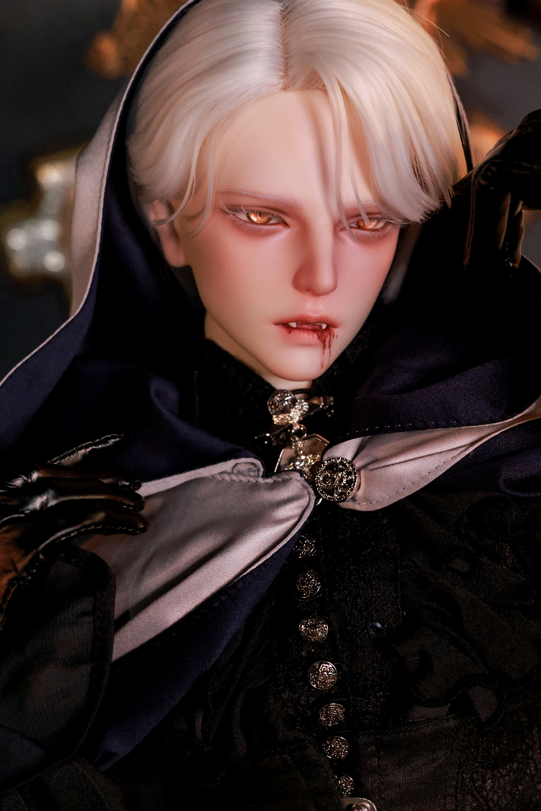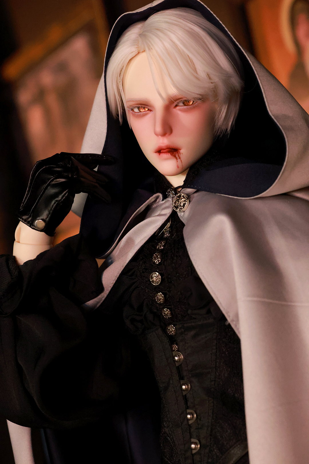 本コラボレーションでは「吸血鬼」をテーマに、尋簡(Xunjian)の持つ端正な造形を、凄艶な姿へと生まれ変わらせました。吸い込まれるような鋭い視線や、人ならざるものを感じさせる神秘的な肌質感。細部に至るまで荒浍氏の美意識が宿る、芸術的な仕上がりを楽しめます。
