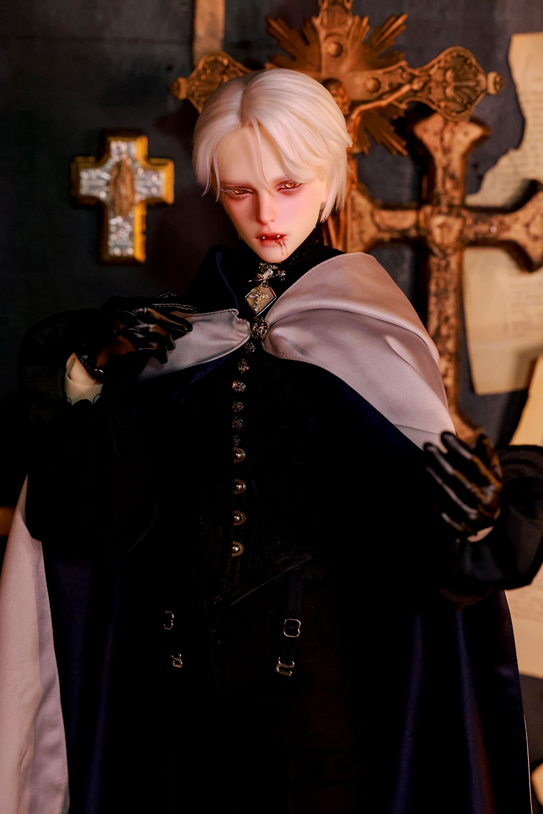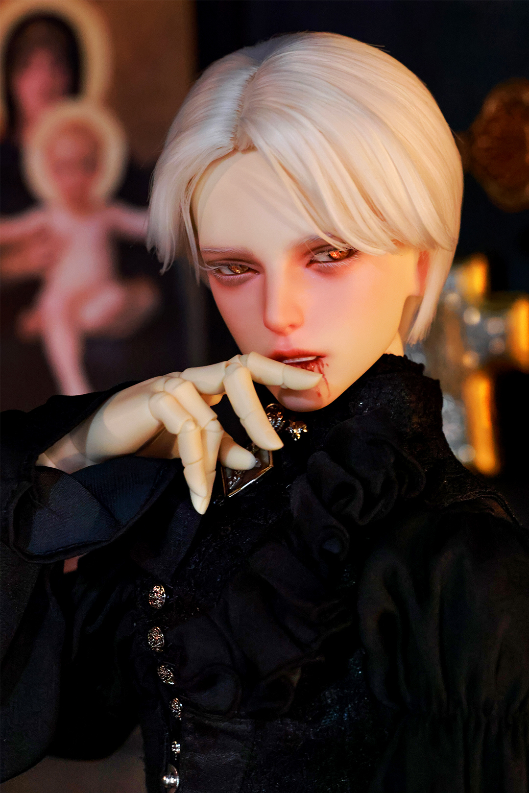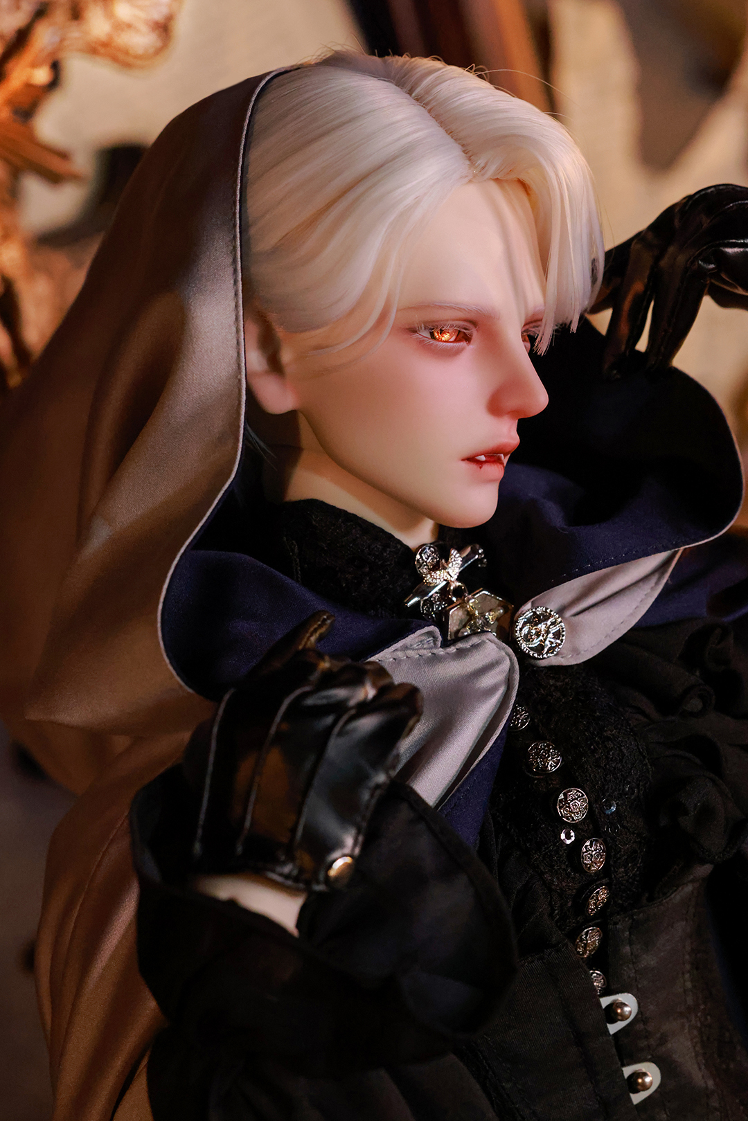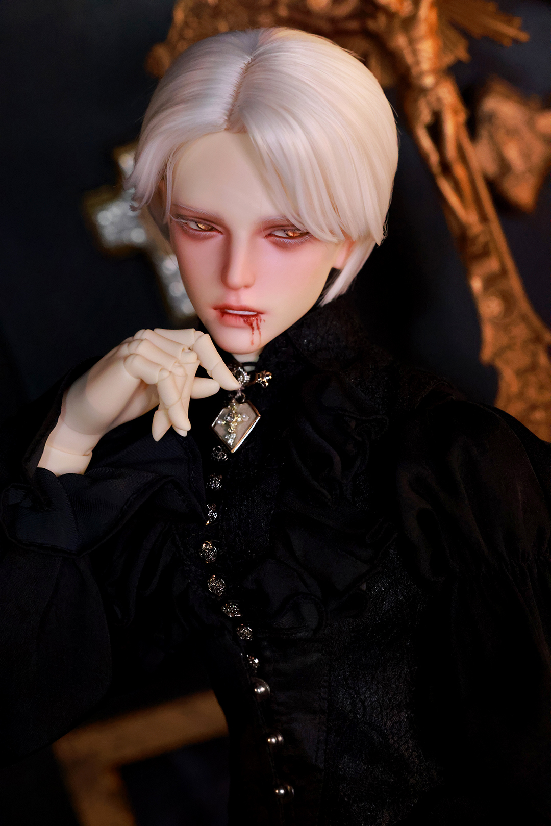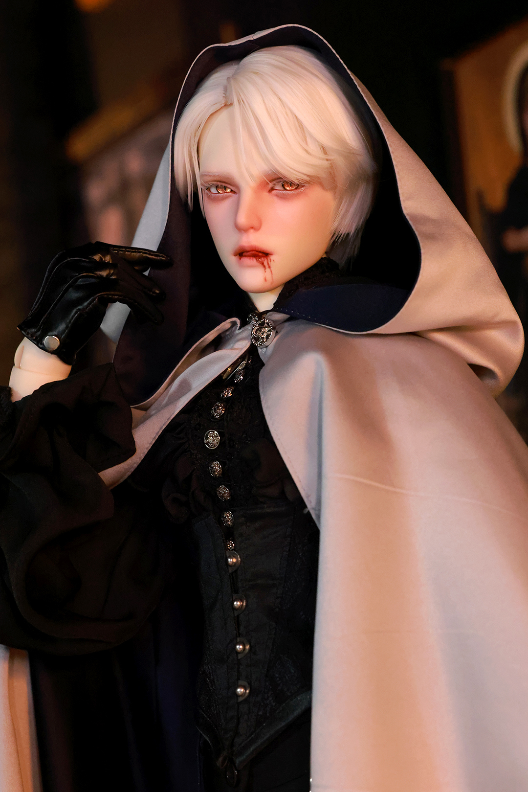 本コラボレーションでは「吸血鬼」をテーマに、尋簡(Xunjian)の持つ端正な造形を、凄艶な姿へと生まれ変わらせました。吸い込まれるような鋭い視線や、人ならざるものを感じさせる神秘的な肌質感。細部に至るまで荒浍氏の美意識が宿る、芸術的な仕上がりを楽しめます。